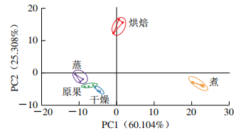 主成分分析(PCA)不僅能降低原始數據的維度還可以保留分開樣本的可變性。由圖5可知,PC1、PC2的貢獻率分別為60.1%和25.3%,累計方差貢獻率為85.4%(>85%),表明其可以有效反映原始數據的整體信息。烘焙和煮處理后的沙棗樣品位于PC1的負半軸,表明這烘焙、煮2類處理方式在PC1上差異明顯。原果、蒸、干燥處理后沙棗樣品在正半軸PC2上,烘焙和其他處理的沙棗樣品得到了較好的分離,其他4種處理方式位置區(qū)域接近,結果表明這4種預處理方式相互之間或許具有一些的相似之處。各樣品組別相互離散、無交叉,說明PCA能夠將不同方式預處理后的沙棗有效的區(qū)分開。因此,可以得出各個樣品組之間可通過電子鼻區(qū)分開并相互獨立,不同處理方式可以在不同程度上改變其沙棗的香氣成分。