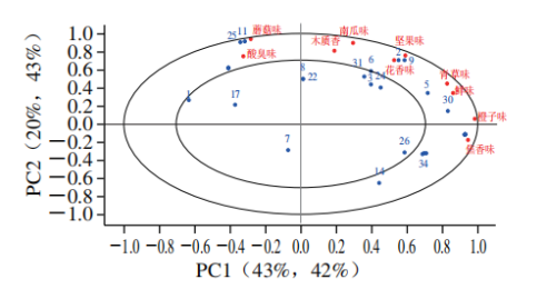 PLSR是一種基于因子的多元回歸將數據分解為不同PC,并建立預測校準模型的方法。如圖6所示,位于同一象限的樣本之間相關性較強,感官屬性與同象限變量相互接近,具有正相關,與對角象限中的變量,具有負相關。PLSR模型解釋了63%的X變量和85%的Y變量。青草香、花香的屬性與壬醛(9)、2-壬酮(5)4-(2-呋喃基)-3-丁烯-2-酮(29)、壬醛(6)呈正相關、焦香的屬性與2,6-二甲基吡嗪(4)、糠醇(20)、2-吡咯甲醛(34)呈正相關,與己酸(25)、庚酸(11)、1-辛烯-3-醇(10)呈負相關,而這3種物質對蘑菇味和酸臭味的屬性具有正向影響,這些與感官評價結果中的感官評分具有很好的一致性(圖2)。