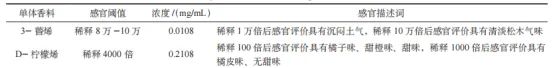 以53%的乙醇為基底逐級稀釋測定3-蒈烯、D-檸檬烯、檜烯、α-蒎烯、β-蒎烯、月桂烯、反式石竹烯嗅覺閾值并確定其感官描述詞。