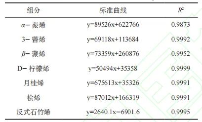 以濃度含量為橫坐標(biāo),峰面積為縱坐標(biāo),繪制各單體香精標(biāo)準(zhǔn)曲線,繪制所得各組分標(biāo)準(zhǔn)曲線的線性相關(guān)系數(shù)R2均大于0.98,可用于實際應(yīng)用。