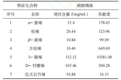 胡椒精油中各香氣成分的貢獻度。越南胡椒精油中貢獻度由大到小進行排序:3-蒈烯>月桂烯>D-檸檬烯>α-蒎烯>檜烯>β-蒎烯>反式石竹烯。