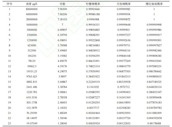 P=0.5時的檸檬烯+月桂烯混合物的濃度為檢測閾值。其檢測閾值為8544.17μg/L。