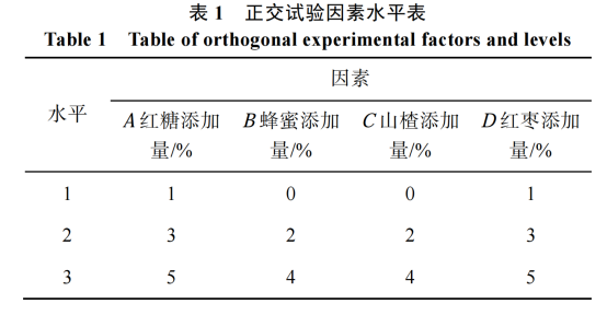 以單因素試驗(yàn)為基礎(chǔ), 選擇紅糖、蜂蜜、山楂、紅棗的添加量為正交試驗(yàn)的 4 個(gè)因素, 采用四因素三水平 L9(34)正交試驗(yàn), 綜合產(chǎn)品的感官評分值和極差分析得到 4 個(gè)因素的最佳添加量, 正交試驗(yàn)因素水平見表 1。