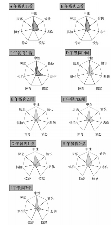 從“看”(視覺)分析得到的情緒雷達(dá)圖見圖2中A~C,能區(qū)別樣品口味的情緒是“悲傷”,午餐肉3占比最高,午餐肉2占比最低。受試者進(jìn)行感官評(píng)價(jià)前,無影響情緒波動(dòng)的因素存在,因此受試者的情緒表現(xiàn)與食物有關(guān)。在此實(shí)驗(yàn)中,午餐肉3的消極評(píng)價(jià)更高,午餐肉2的消極評(píng)價(jià)最低,說明午餐肉2的外部整體特征更能提高實(shí)驗(yàn)者的食欲。從“聞”(嗅覺)分析得到的情緒雷達(dá)圖見圖2中D~F,午餐肉1的氣味積極因素更多,“愉悅”情緒占比較大;而午餐肉3的氣味積極因素較少,消極因素更多。說明從氣味上判斷,午餐肉1的氣味更令人有食欲。從“嘗”(味覺)分析得到的情緒雷達(dá)圖見圖2中G~I,午餐肉1和午餐肉2的口感“愉悅”情緒顯著高于午餐肉3;而午餐肉1和午餐肉3的“悲傷”情緒顯著高于午餐肉2,說明從口感上判斷,午餐肉2更能提高實(shí)驗(yàn)者的食欲。雖然從嗅覺評(píng)價(jià)上午餐肉1的氣味最佳,但從視覺和味覺上評(píng)價(jià),午餐肉2的外觀和口感最佳。此結(jié)論與傳統(tǒng)的感官評(píng)價(jià)結(jié)論一致,午餐肉2是口感最佳的午餐肉樣品。