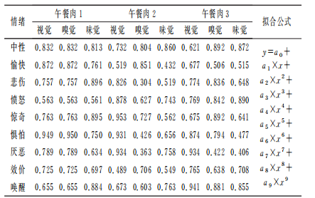 人們對(duì)食物是否可口的判斷也是持續(xù)變化的過程,這個(gè)過程包括食物外觀質(zhì)地的判斷、氣味的甄別和口感的體驗(yàn)等,因此圖3~圖5分別從視覺、嗅覺和味覺3個(gè)方面,持續(xù)觀察了感官評(píng)價(jià)人員的情緒變化。由圖3~圖5可知,擬合曲線的變化趨勢(shì)與實(shí)際變化趨勢(shì)一致,由表2可知,缺失值較少的曲線擬合效果較好。同時(shí)圖3~圖5中也分析了實(shí)驗(yàn)人員的情緒效價(jià)和喚醒因素。