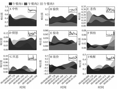 實(shí)驗(yàn)人員觀察3種午餐肉時(shí),情緒喚醒響應(yīng)值維持在0.3左右,機(jī)體對(duì)樣品的反應(yīng)強(qiáng)度類似。“中性”表示未引起實(shí)驗(yàn)者情緒表達(dá),“中性”值越高,情緒表達(dá)越低。“愉快”和“驚奇”的響應(yīng)值越高,越能說明樣品的可接受度高;而“悲傷”、“憤怒”、“懼怕”和“厭惡”的響應(yīng)值越高,說明樣品的可接受度越低。為了描述便利,本文將“中性”標(biāo)為情緒壓制,“愉快”和“驚奇”2種情緒稱為積極情緒,“悲傷”、“憤怒”、“懼怕”和“厭惡”4種情緒稱為消極情緒。從視覺上分析,午餐肉2引起實(shí)驗(yàn)者的情緒表達(dá)最高,午餐肉1最低;午餐肉3的積極情緒響應(yīng)值明顯低于另外兩種,而午餐肉1比午餐肉2更能使人感到愉悅。從觀測(cè)時(shí)間上看,午餐肉1“愉快”響應(yīng)值突降的時(shí)間正是午餐肉2“驚奇”響應(yīng)值陡增的時(shí)間,說明情緒的分配是不平衡的,也可以反映出隨著觀察深入,午餐肉2的某些特征更能獲取實(shí)驗(yàn)者的青睞。從消極情緒上看,3種午餐肉“憤怒”和“厭惡”的響應(yīng)值接近,而“悲傷”和“懼怕”的響應(yīng)值差異更顯著,而這兩種消極情緒都表明午餐肉3的接受度最低,午餐肉2的接受度最高。此結(jié)論和傳統(tǒng)的感官評(píng)價(jià)結(jié)論一致,都表明午餐肉2的外觀更能讓人相信食物“美味”。