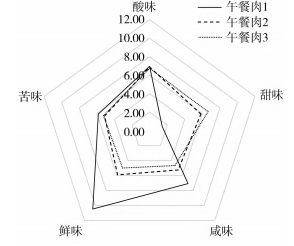 由圖5可知,午餐肉2的情緒反應(yīng)最高,午餐肉1的情緒反應(yīng)最低;從積極情緒上分析,午餐肉2使人感到“愉快”和“驚奇”,午餐肉1次之,午餐肉3最低。從消極情緒上判斷,午餐肉3令人感到“悲傷”和“厭惡”,午餐肉1令人感到“憤怒”和“懼怕”,說明午餐肉3的口感更不盡如人意,而午餐肉1的口感與實(shí)驗(yàn)者期待的滋味差別較大。因此,味覺實(shí)驗(yàn)表明,午餐肉2的口感可接受度最高,這與感官評(píng)價(jià)的結(jié)論一致。電子舌分析結(jié)果