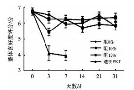 將3種不同質(zhì)量分數(shù)的阻光色油PET瓶灌裝的鮮牛奶和透明PET瓶罐裝的鮮牛奶進行0~31d感官品評,品評時間點分別為0,3,7,14,21和31d,結(jié)果如圖1~圖4所示。在31d內(nèi)各樣品的整體喜好度均呈下降趨勢,其中透明PET瓶明顯不受喜歡,在3d時整體喜好度平均值<5(透明PET各指標只測試到7d),與3個阻光色油PET瓶裝樣品相比存在顯著性差異,3個不同質(zhì)量分數(shù)的阻光色油PET樣品的整體喜好度平均值相比均無顯著性差異,整體下降趨勢不明顯,均優(yōu)于透明PET瓶樣品。