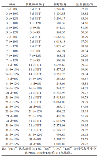 從表2獲知,在相同時間點內(nèi),透明PET樣品與3個不同質(zhì)量分數(shù)阻光色油樣品的區(qū)別指數(shù)均較大,即從初始測試時間3d起,透明PET瓶就與阻光色油PET樣品的相對距離較大,區(qū)別指數(shù)均在92%以上,而且隨著光照時間的增加,透明PET瓶與阻光色油PET瓶相對距離不斷增大,進一步表明,透明PET樣品與3個阻光色油PET樣品差異最大。反觀3個阻光色油PET樣品之間互相比較的區(qū)別指數(shù)、相對距離相似無明顯差別,兩兩之間無明顯相近的樣品,這與感官測評結(jié)果一致,阻光PET瓶的樣品更穩(wěn)定。