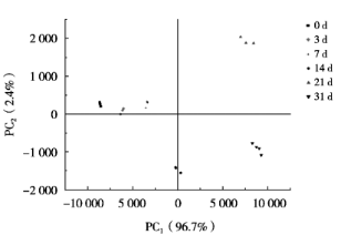 透明PET樣品與3個不同質(zhì)量分數(shù)的阻光色油PET樣品間風味差異大,為進一步分析透明PET瓶樣品不同時間點的風味變化,將透明PET樣品進行單獨的PCA分析,圖5為透明PET樣品6個時間點的PCA分類結(jié)果,其中PC1和PC2總貢獻率達到99.1%,能夠有效區(qū)分不同時間點的樣本風味,從圖中看樣品間存在明顯差異,其中0,3和7d相對氣味距離均較近,差異較小,與14,21和31d相對氣味距離較遠,差異較大。