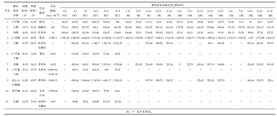 物質(zhì)定性分析通過正構(gòu)烷烴標樣計算保留指數(shù),利用AroChembase數(shù)據(jù)庫將0d樣品與所有樣品的差異色譜峰分別進行定性及含量分析,可能含有的揮發(fā)性化合物見表3,此次試驗所用儀器為質(zhì)量型檢測器-氫離子火焰監(jiān)測器,揮發(fā)性化合物含量的多少表征在峰面積上,表3中呈現(xiàn)了不同揮發(fā)性化合物的峰面積。結(jié)果顯示,三甲胺、乙醇、2-丙醇的含量隨著時間的增長也隨之增長,在未阻隔的透明PET瓶樣品中增長尤為明顯。戊醛作為光敏作用的產(chǎn)物之一,其存在于透明PET瓶所有檢測時間點內(nèi),阻光色油8%和10%阻隔PET瓶的7~31d,阻光色油12%阻隔PET瓶14~31d,且該物質(zhì)在透明PET瓶中的含量要遠高于阻隔PET瓶。12%阻隔PET瓶中檢測到的時間晚于8%和10%阻隔PET瓶,可見稍高的質(zhì)量分數(shù)對戊醛的產(chǎn)生有一定的延緩作用。2-甲基丁醛、二甲基二硫、苯甲醛和己酸僅在未避光的透明PET樣品檢測到,在14d達到頂峰而后下降。Kim等的研究表明,戊醛、2-丙醇和二甲基二硫是由光敏作用產(chǎn)生的,二甲基二硫會隨著光照時間的增加,濃度不斷增加。乙酸具有奶香味及酸味,可能存在于所有樣品,不同的是該化合物在透明PET瓶中的含量顯著高于有避光措施的阻光色油PET瓶樣品,其隨著光照時間的延長,乙酸含量也隨之增加。苯甲醛作為牛奶光氧化的特征化合物,在一定程度上表征了牛奶的品質(zhì)情況,其含量愈高品質(zhì)愈下降。由表3所示,苯甲醛出現(xiàn)在透明PET各時間點的樣品中,14d時最高,之后下降趨于平穩(wěn),結(jié)合感官品評結(jié)果來看,該樣品3d時非培訓型評價員的整體喜好度已處于接受程度以下,可見光照嚴重影響了鮮牛奶的整體感官品質(zhì)。