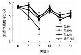 利用人工感官與智能儀器電子鼻相結(jié)合的方式,對光照條件下不同PET瓶裝鮮牛奶風味進行分析。由感官評價可知:透明PET瓶在3d時,整體喜好度平均值低于5分,異味、氧化味強度顯著強于添加不同質(zhì)量分數(shù)的阻光色油PET瓶,而不同質(zhì)量分數(shù)的阻光色油PET瓶樣品在超出保質(zhì)期的31d時喜好度平均值均高于5分,在一定程度上延長了鮮牛奶的保質(zhì)期。由樣品間距離分析可知,透明PET瓶與不同質(zhì)量分數(shù)的阻光色油PET瓶在各時間點均存在較大差異,不同質(zhì)量分數(shù)的阻光色油PET瓶之間無差異。對差異性物質(zhì)進行定性及含量分析,結(jié)果顯示:隨著光照時間的增加,三甲胺、2-丙醇、戊醛、2-甲基丁醛、二甲基二硫、苯甲醛和己酸的含量隨之增多,其中,2-甲基丁醛、二甲基二硫、苯甲醛和己酸僅在未避光的透明PET瓶樣品中出現(xiàn),表明光照對鮮牛奶風味的影響顯著,在不同質(zhì)量分數(shù)PET阻隔瓶中,8%的PET阻隔瓶亦可有效保護鮮牛奶的風味,阻光色油質(zhì)量分數(shù)相差4%左右對產(chǎn)品風味影響不大。、