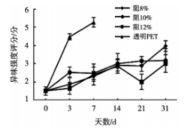 在感官強度指標分析中,透明PET瓶各感官指標變化最為顯著,隨光照時間的增加,奶香氣強度顯著減弱,異味、氧化味強度顯著增強,而有避光措施的阻光色油8%,10%和12%PET瓶樣品整體喜好度、奶香氣強度呈略下降趨勢,異味、氧化味強度稍呈上升趨勢,三者相比無顯著性變化,添加了阻光色油的PET樣品明顯比無避光的透明PET瓶對鮮牛奶的品質(zhì)更具保護力。