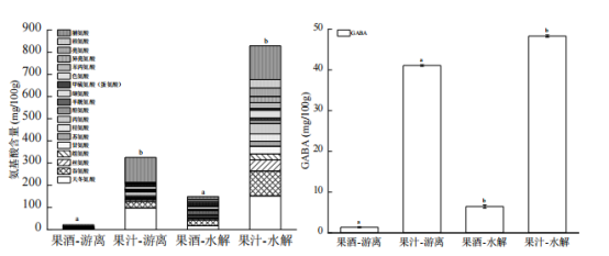 果汁酒和原果汁中均檢測到18種游離氨基酸,與百香果果汁相比,百香果果酒的甜味氨基酸(Thr、Gly、Ala、Pro、Ser)的占比增加了5.90%,苦味氨基酸(His、Met、Arg、Val、Leu、Ile、Tyr、Phe)含量也顯著下降。經(jīng)完全水解后,兩個樣品中的氨基酸含量都有所增加。