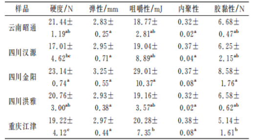 采用質(zhì)構(gòu)儀測定硬度、彈性、咀嚼性、內(nèi)聚性、膠黏性5個指標(biāo),判斷魚肉質(zhì)構(gòu)的變化。不同產(chǎn)地的青花椒對花椒魚片質(zhì)構(gòu)特性的影響不同,結(jié)果見表3。