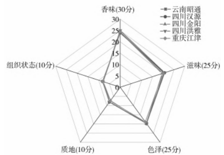 采用表1中花椒魚片的評分標(biāo)準(zhǔn)對不同產(chǎn)地青花椒制作的花椒魚片進(jìn)行感官分析,結(jié)果見圖1。以四川洪雅青花椒為原料制作的花椒魚片評分最高,整體感官評分為81.6分,尤以花椒魚片的香味和滋味評分較高,但差異不顯著(P>0.05)。