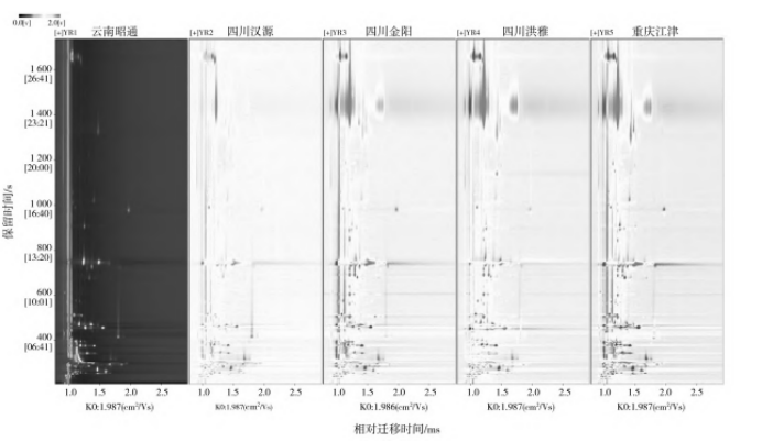 青花椒產(chǎn)地對花椒魚片風(fēng)味物質(zhì)的影響花椒魚片樣品的揮發(fā)性物質(zhì)GC-IMS三維圖譜見圖2。圖2中每個反應(yīng)離子峰代表一種揮發(fā)性風(fēng)味物質(zhì),顏色越深,表示物質(zhì)越豐富。使用不同產(chǎn)地的青花椒制作花椒魚片時,可以直觀地看到四川金陽和重慶江津樣品組中風(fēng)味物質(zhì)的種類和濃度與其他樣品組差異較明顯?;ń肤~片特征性風(fēng)味成分GC-IMS差異譜圖見圖3,此圖是將圖2的三維圖投影到二維平面上的俯視圖,具體是以氣相色譜的保留時間作為縱坐標(biāo),以離子遷移時間作為橫坐標(biāo),以云南昭通青花椒樣品組譜圖為參比,將另外4個樣品組的譜圖扣減參比后得到的。差異圖譜中每個點(diǎn)代表一種揮發(fā)性風(fēng)味物質(zhì)。結(jié)果顯示,與云南昭通樣品組相比,四川金陽和重慶江津樣品組的風(fēng)味物質(zhì)濃度較高。