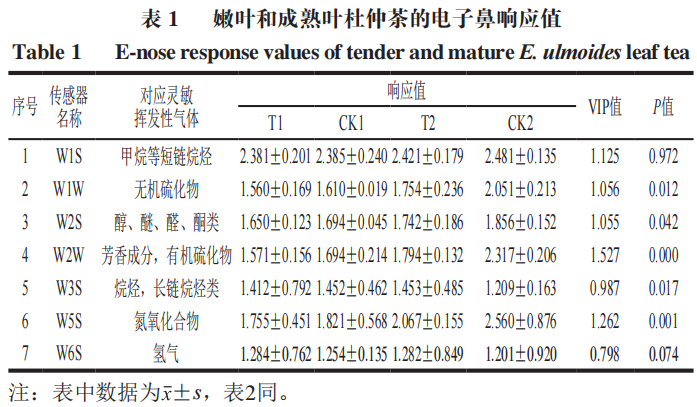 杜仲嫩葉和成熟葉茶的電子鼻響應(yīng)值表1所示,7 個傳感器對嫩葉和熟葉杜仲茶樣氣味的響應(yīng)值不同。在7 個傳感器中,W1W、W2S、W2W和W5S 4 個傳感器的響應(yīng)值在4 個茶樣中存在顯著差異(P<0.05,VIP>1),即這4 個傳感器檢測到的揮發(fā)性物質(zhì)對杜仲茶樣氣味的貢獻較大。