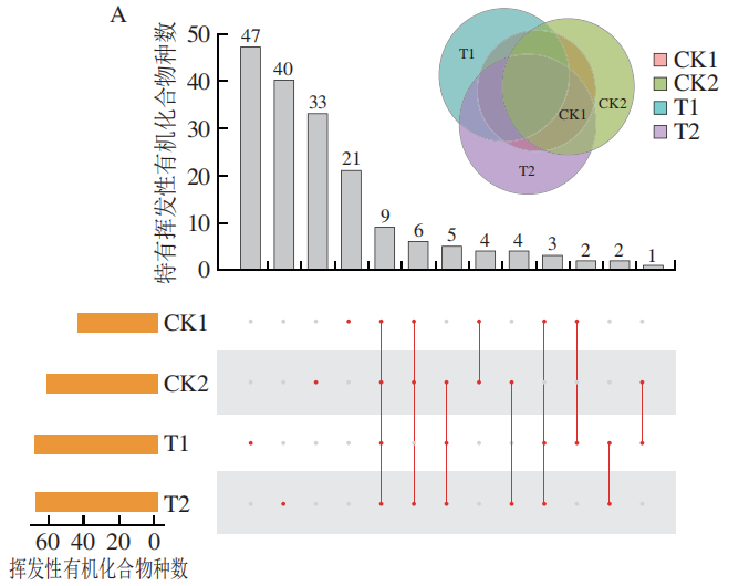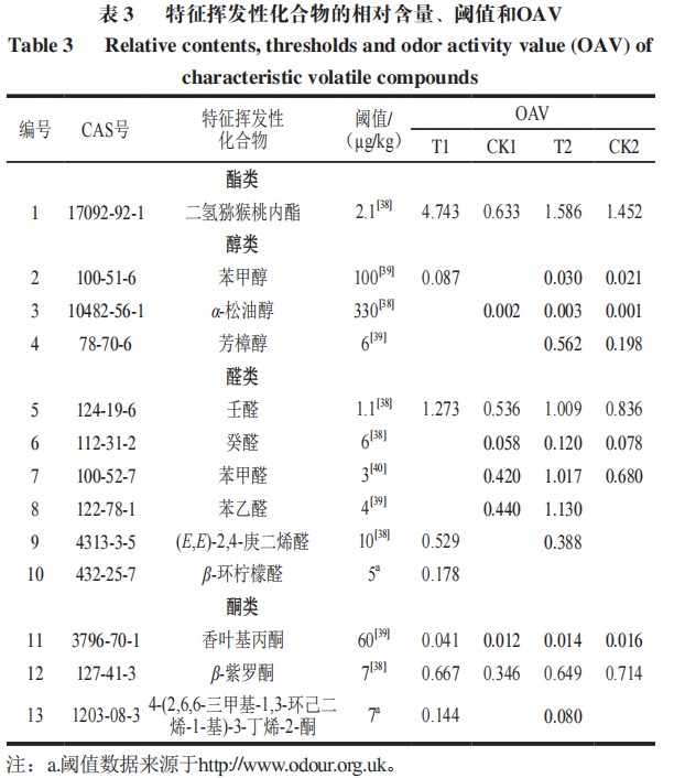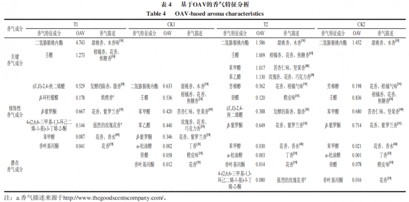 基于OAV的香氣特征分析如表4所示,當OAV>1時,定義為關(guān)鍵香氣成分,該香氣成分對總體香氣有直接影響;當0.1<OAV≤1時,定義為修飾性香氣成分,該香氣成分對總體香氣有輔助影響;當0<OAV≤0.1時,定義為潛在香氣成分,該香氣成分對總體香氣有潛在影響。在一定范圍內(nèi),OAV越大說明該香氣成分對總體風味貢獻越大。T1的關(guān)鍵香氣組分(OAV>1)為二氫獼猴桃內(nèi)酯和壬醛,呈現(xiàn)甜桃香、木香、柑橘香、花香、焦糖香,CK2為二氫獼猴桃內(nèi)酯,呈現(xiàn)甜桃香、木香,T2為二氫獼猴桃內(nèi)酯、壬醛、苯甲醛和苯乙醛,呈現(xiàn)甜桃香、木香、柑橘香、花香、焦糖香、苦杏仁味、堅果香、玫瑰香、巧克力香。二氫獼猴桃內(nèi)酯在T1、T2和CK2 3 種茶樣香氣中均占主導地位,其OAV以T1最高,為4.743,其次是T2為1.586。