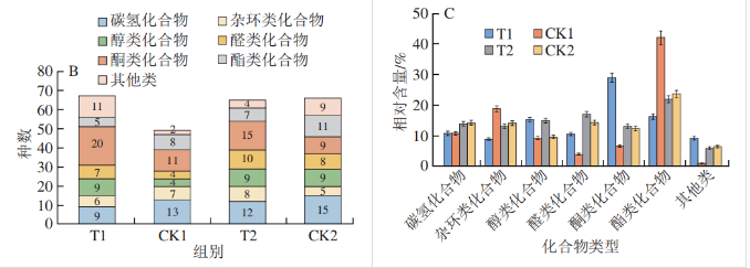為探究嫩葉和熟葉杜仲茶汽爆前后制成杜仲茶的香氣特征差異,利用HS-SPME-GC-MS聯(lián)用對4 種處理杜仲茶的揮發(fā)性化合物成分和相對含量進行分析鑒定,得到其總離子流圖(圖4),共檢測到177 種揮發(fā)性物質(zhì),其中,CK1、T1、CK2和T2中可鑒定的峰面積分別占比92.32%、100.00%、94.50%和100.00%。根據(jù)化合物類型將其分為碳氫化合物、雜環(huán)類化合物、醇類化合物、醛類化合物、酮類化合物、酯類化合物和其他類化合物。由圖5A可知,CK1、T1、CK2和T2 4 個處理所制的杜仲茶揮發(fā)性化合物種數(shù)差異顯著,數(shù)量排序為T1>CK2>T2>CK1,汽爆處理后的成熟葉茶揮發(fā)性化合物種類高于未汽爆處理,增加了16 種,而嫩葉茶汽爆前后揮發(fā)性化合物種類無顯著差異。其中,嫩葉茶汽爆后醛類、酮類和雜環(huán)類分別增加了2、6 種和3 種,成熟葉茶汽爆后醇類、醛類和酮類分別增加了5、3 種和9 種(圖5B)。CK1、T1、CK2和T2 4 種杜仲茶揮發(fā)性化合物相對含量的差異也十分顯著,酯類是相對含量最高的化合物類型,相對含量分別為42.07%、16.33%、23.70%和21.89%;酮類相對含量分別為6.63%、29.05%、12.30%和13.15%;碳氫類的相對含量分別為10.76%、10.83%、14.20%和13.89%;醇類的相對含量分別為9.27%、15.22%、9.48%和14.87%;雜環(huán)類的相對含量分別為18.73%、8.83%、14.13%和13.13%;其他類的相對含量分別為0.90%、8.68%、5.25%和4.92%(圖5C)。