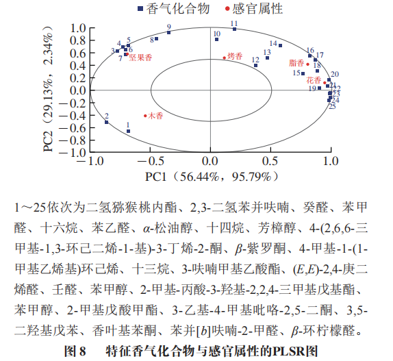 3.3 特征香氣化合物與感官評定之間的相關(guān)性分析