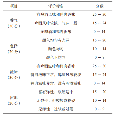 表1 啤酒鴨感官評分標(biāo)準(zhǔn)