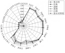 不同啤酒鴨在電子鼻各個傳感器上的響應(yīng)值如圖1所示,在T30/1、P10/1、P10/2、P40/1和T70/2這五個探頭上,啤酒鴨的響應(yīng)值存在明顯差異。