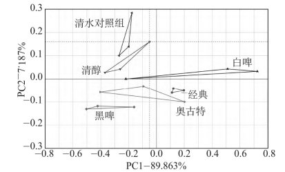 啤酒鴨電子舌檢測結(jié)果主成分分析如圖4。主成分1和主成分2的貢獻率分別為89.79%和7.70%,累計97.49%,說明這兩個主成分可以代表樣品整體信息。雖然不同啤酒鴨在電子舌傳感器上響應(yīng)值差異較小,但利用主成分分析還是能將其明顯區(qū)分開,說明不同啤酒制作的啤酒鴨滋味存在差異,其中白啤組與其他組差異較大。