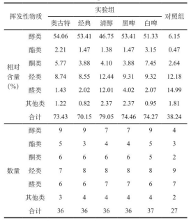 4.GC-MS結(jié)果分析通過GC-MS測定不同種類啤酒制作啤酒鴨樣品的風(fēng)味物質(zhì)及其相對含量。各樣品鑒得醇類、酯類、醛類、酮類、烴類以及其他類(醚類、含氮類及呋喃等)揮發(fā)性化合物,其中來源于啤酒的醇類物質(zhì)占據(jù)實驗組最重要位置。由表3可知,實驗組所檢測的揮發(fā)性化合物,各樣品風(fēng)味物質(zhì)含量皆不同,但醇類和烴類都為其主要化合物,種類及含量皆高于對照組。