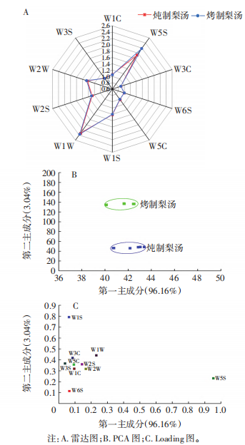 由圖1A可知,兩種梨湯在10種傳感器上的響應(yīng)各異,在W5S、W1W和W2W傳感器上的響應(yīng)值較大。由圖1B的PCA結(jié)果顯示,第一主成分(PC1)和第二主成分(PC2)的貢獻率分別為96.16%和3.04%,總貢獻率為99.20%,充分涵蓋了兩種梨湯樣品的主要信息,燉制梨湯和烤制梨湯能夠完全分離,說明其氣味具有明顯差異。Loading分析可用于判斷各傳感器對樣品的區(qū)分能力,各傳感器在某主成分軸上的特征向量絕對值越大,表示該傳感器對此主成分的貢獻率越大。由圖1C可知,傳感器W5S對樣品區(qū)分能力最佳,其次為W1W、W2W、W1S和W2S,其中W5S對第一主成分貢獻率最大,W1S對第二主成分貢獻率最大。