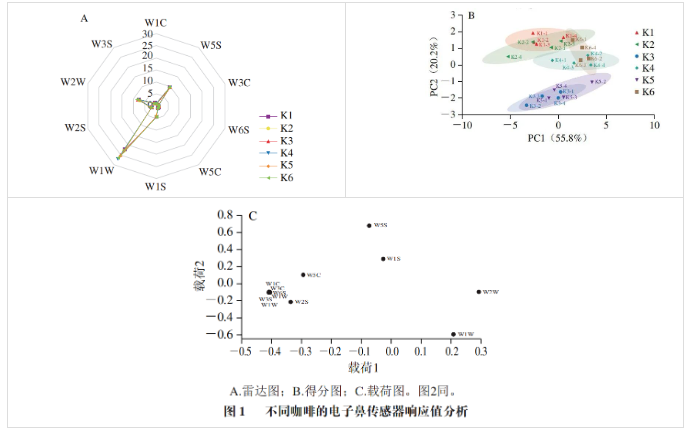 02 不同咖啡的滋味輪廓分析利用電子舌快速分析滋味輪廓,如圖2A所示。6種樣品的雷達(dá)圖輪廓類似,只有酸味傳感器的響應(yīng)值為負(fù),說(shuō)明酸味對(duì)咖啡整體滋味的貢獻(xiàn)較小。各樣品在鮮味與咸味傳感器上的響應(yīng)值差異最大,表明這兩種傳感器對(duì)滋味特征的區(qū)分效果最好。為根據(jù)滋味特征進(jìn)一步區(qū)分6種咖啡,對(duì)電子舌傳感器響應(yīng)值結(jié)果進(jìn)行PCA(圖2B)。6種咖啡輪廓未重疊,滋味特征明顯,易被區(qū)分。K3、K5和K6咖啡在PC1的正方向,主要受鮮味、咸味、厚味影響;K1、K2和K4咖啡在PC1的負(fù)方向,主要由澀味、酸味、苦味影響(圖2C)。每個(gè)樣品聚類的距離與滋味特征接近度相關(guān),有相同咖啡配比的K1~K4樣品,烘焙程度不同,距離較遠(yuǎn),說(shuō)明電子舌可以區(qū)分不同烘焙度的咖啡。K5、K6咖啡分別與K1、K3咖啡輪廓接近,說(shuō)明不同的咖啡配比在一定程度上能夠彌補(bǔ)烘焙程度的差異,使不同烘焙度的咖啡具有類似的滋味輪廓。