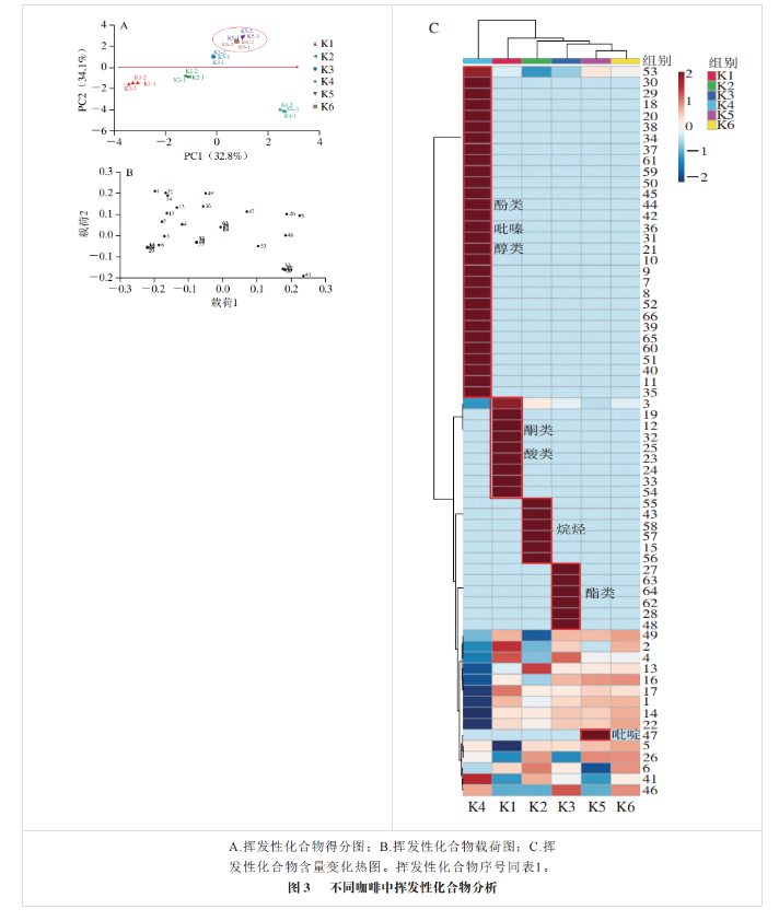 咖啡中各揮發(fā)性成分的產(chǎn)生機(jī)理相同,即通過(guò)美拉德反應(yīng)、斯特萊克降解和脂質(zhì)氧化等過(guò)程形成,可賦予咖啡不同的香氣。6 種咖啡樣品的66 種揮發(fā)性成分如表1所示。K1~K4咖啡隨著烘焙程度增加,揮發(fā)性化合物種類增多。這是由于輕度烘焙的熱加工時(shí)間較短,則各類反應(yīng)持續(xù)的時(shí)間較短,所以產(chǎn)生的化合物較少。K5、K6咖啡的埃塞爾比亞咖啡豆配比更高,可能是導(dǎo)致其揮發(fā)性物質(zhì)種類較少的原因。K1~K4咖啡的呋喃類物質(zhì)含量均隨烘焙程度的增加呈先上升后下降的趨勢(shì)。吡嗪類物質(zhì)隨烘焙程度的增加而減少,可能是因?yàn)榱h(huán)受熱斷裂加劇,生成烯烴類進(jìn)一步揮發(fā)。為進(jìn)一步探究揮發(fā)性成分的差異,進(jìn)行PLS-DA,尋找導(dǎo)致組間區(qū)別的影響變量。由圖3A可知,各樣品間輪廓沒(méi)有重疊,K1~K4咖啡隨著烘焙程度的增加,由PC1的負(fù)半軸遷移至正半軸;與其產(chǎn)地、混合配比不同的K5與K6咖啡十分接近,但仍不重疊。顯然利用GC-MS檢測(cè)得到的揮發(fā)性成分進(jìn)行不同咖啡的鑒別與區(qū)分的效果優(yōu)于電子鼻。如圖3B所示,影響淺度烘焙咖啡香氣的化合物有2-乙基-3,5-二甲基吡嗪、2-己酮、2-乙基-1-己醇等。影響中度烘焙咖啡香氣的化合物有丙酮、戊酸甲酯、4-吡啶醇等。影響中深度烘焙咖啡香氣的化合物有愈創(chuàng)木酚、2,6-二甲基吡嗪、苯甲醛等。聚類熱圖結(jié)果與得分圖結(jié)果一致。K1咖啡的特異性化合物主要是酮類和酸類,如2-己酮和異戊酸,使其有酸味和醚味。K2咖啡的特異性化合物包括十九烷、4-乙基-5-甲基壬烷等烷烴類。K3咖啡的特異性物質(zhì)有戊酸甲酯,為其增添水果味。K4咖啡獨(dú)特的木質(zhì)香、堅(jiān)果香及花香分別由酚類、吡嗪類和醇類帶來(lái),例如丁香酚、2,6-二甲基吡嗪、2-乙基-1-己醇。