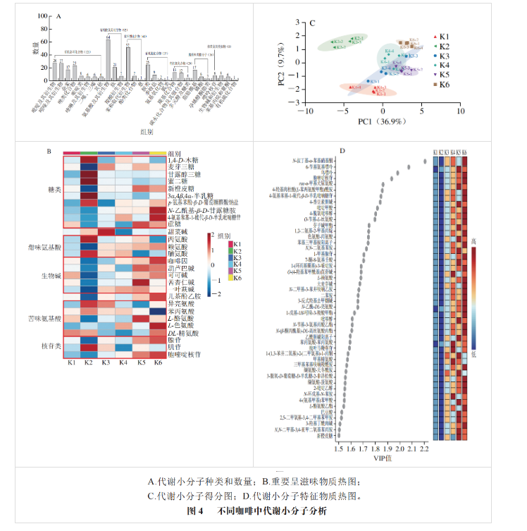 通過(guò)PLS-DA對(duì)不同咖啡代謝小分子的關(guān)系進(jìn)行綜合分析。由圖4C可知,K1、K2是淺度烘焙咖啡,在PC1的負(fù)半軸,中度、中深度烘焙咖啡在PC1的正半軸、原點(diǎn)附近,可以明顯區(qū)分。由圖4D可知,L-酪氨酸乙酯、色氨酸-丙氨酸、纈氨酸-天冬酰胺等12種氨基酸及肽類似物,巴豆酸、戟葉馬鞭草苷等5種脂類,鳥(niǎo)嘌呤、1-甲基腺苷等48 個(gè)化合物是引起各樣品差異的主要差異代謝物(變量投影重要性(VIP)>1.5)。區(qū)分6 種不同咖啡的烘焙度及產(chǎn)地,可直接選用部分呈滋味化合物,如胞嘧啶核苷、賴氨酸、新橙皮糖等,但更多的是與咖啡的非呈滋味代謝物有關(guān)。有研究通過(guò)超高效液相色譜串聯(lián)質(zhì)譜進(jìn)行代謝組學(xué)分析得到36 種云南小??Х扰c埃塞俄比亞咖啡的潛在標(biāo)志物,包括多酚16 種、脂質(zhì)類8 種、糖類6 種以及少量生物堿類、有機(jī)酸類、萜類。