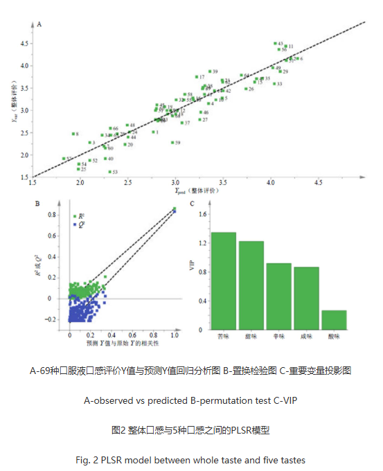 口服液整體口感預(yù)測(cè)模型:置換檢驗(yàn)的R2回歸線的Y軸截距為−0.0176,Q2回歸線的Y軸截距為−0.3290,表明建立的模型沒(méi)有出現(xiàn)過(guò)度擬合,預(yù)測(cè)能力良好;圖2-C為口嘗結(jié)果PLSR模型獲取其變量重要性投影圖,通過(guò)該模型獲取其變量重要性投影(variableimportancefortheproject,VIP)值,VIP值是反映自變量對(duì)因變量的解釋能力的重要指標(biāo),VIP值越大說(shuō)明自變量對(duì)因變量解釋能力越強(qiáng),其中苦味和甜味VIP值>1,說(shuō)明苦味和甜味是影響口服液整體口感的重要變量。