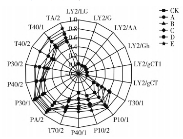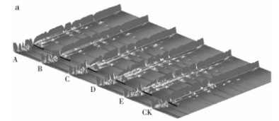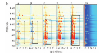 圖4是6種不同烹飪熟度的牛排揮發(fā)性風(fēng)味化合物譜圖,圖中每個(gè)點(diǎn)代表一種物質(zhì),淺色表示濃度較低,深色表示濃度較高,顏色越深表示濃度越大7。由圖4可知,牛排的揮發(fā)性風(fēng)味物質(zhì)能通過(guò)GC-IMS得到很好的分離,其中圖中標(biāo)記的橫線和方框處為6種不同熟度牛排中的差異性化合物,隨著牛排成熟度的增加,樣品中化合物的數(shù)量和濃度不斷增加,并且均高于對(duì)照組,其中在樣品A、B中,化合物的整體濃度較相似,即牛排介于一成熟和三成熟之間時(shí),樣品的整體風(fēng)味輪廓較相似,而在樣品D、E中,化合物的整體風(fēng)味物質(zhì)的濃度較相似,說(shuō)明牛排介于七成熟和九成熟之間時(shí),樣品的整體輪廓較相似,與前文電子鼻結(jié)果一致。