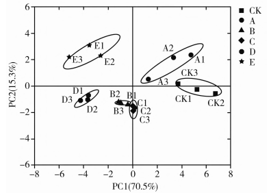 由圖3可知,不同熟度樣品之間風(fēng)味具有差異,并且樣品之間的重復(fù)性較好。PC1的貢獻(xiàn)率為70.5%,PC2的貢獻(xiàn)率為15.3%,累計(jì)貢獻(xiàn)率大于85%,說(shuō)明該模型具有較高的可靠性[16]。根據(jù)樣品在PCI上的距離,可將樣品分為三類(lèi):樣品CK和A為一類(lèi),樣品B和C為一類(lèi),而樣品D、E為一類(lèi),說(shuō)明在較低烹飪熟度下,樣品中的揮發(fā)性風(fēng)味物質(zhì)較少,與生肉較相似:隨著烹飪熟度的增加,即在三成熟和五成熟的條件下,牛肉中的揮發(fā)性物質(zhì)較相似,并且與對(duì)照組具有明顯差異,說(shuō)明烹飪熟度會(huì)影響牛肉中揮發(fā)性風(fēng)味物質(zhì)的形成;當(dāng)烹飪熟度達(dá)到七成熟以上時(shí),牛肉中的揮發(fā)性化合物具有高度的相似性。GC-IMS分析