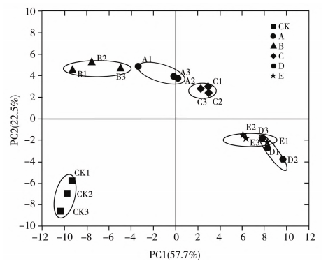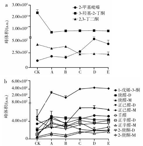 與樣品CK相比,部分化合物在樣品A、E中具有較高的含量,說(shuō)明這部分物質(zhì)是烹飪后產(chǎn)生的,牛排在烹飪過(guò)程中由于高溫產(chǎn)生的美拉德反應(yīng)或者脂質(zhì)的熱分解產(chǎn)生的一系列揮發(fā)性風(fēng)味物質(zhì),導(dǎo)致烹制后的牛排風(fēng)味更豐富。