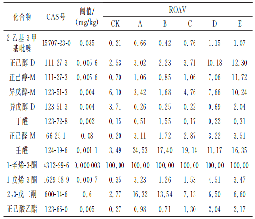 并不是樣品中化合物的含量越高,其對(duì)整體風(fēng)味貢獻(xiàn)就越高,而是需要結(jié)合其閾值一起分析,相對(duì)氣味活度值用來(lái)判定樣品中對(duì)整體風(fēng)味貢獻(xiàn)較大的物質(zhì),見(jiàn)表1。
