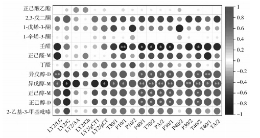 為研究電子鼻傳感器與香氣化合物之間的關(guān)系,采用Pearson相關(guān)系數(shù)對(duì)電子鼻傳感器與ROAV>1的香氣化合物進(jìn)行相關(guān)性分析,見(jiàn)圖8。由圖8可知,電子鼻的T和P傳感器與大多數(shù)化合物有相關(guān)性,比如T30/1、P1O/1、P¹0/2、P40/1、T70/2、PA/2、P30/1、P40/2、P30/2、T40/2、T40/1、TA/2,傳感器與樣品中的異戊醇-D、異戊醇-M、正己醇-M、正己醇-D、2-乙基-3-甲基吡嗪具有較高的正相關(guān)性,并且異戊醇-M與大多數(shù)T和P傳感器具有極顯著性(P<0.01);而壬醛與P10/1、P40/1、T70/2、PA/2、P30/1和T40/2傳感器具有顯著性負(fù)相關(guān)(P<0.05)。