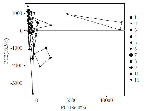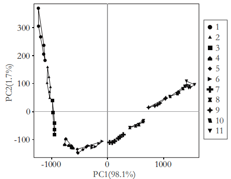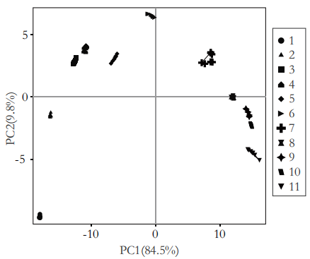由圖3可知,第一和第二主成分貢獻(xiàn)率之和達(dá)到99.8%,即這2種主成分涵蓋了11組樣本絕大部分的原始數(shù)據(jù)信息,其中PC1的貢獻(xiàn)率為98.1%,PC2的貢獻(xiàn)率為1.7%,且樣本間的差異主要表現(xiàn)在第一主成分上。各樣本之間均無重合,表明電子舌技術(shù)能夠明顯地將不同比例苦蕎米飯區(qū)分。在PCA圖中隨著苦蕎米添加量的增加,樣本逐漸從X軸的左軸向右軸移動(dòng),各樣本在滋味上呈現(xiàn)一致規(guī)律,表明隨著苦蕎米比例增加滋味逐漸變化。由于PC1的貢獻(xiàn)率大,所以樣本在橫坐標(biāo)上的距離越大,表明了樣本之間的差異越大。結(jié)合圖2可知,苦蕎米添加量越高,酸味、咸味、鮮味、基本味的響應(yīng)值越大,與PCA圖的變化趨勢相對應(yīng),其中4號(hào)樣與3號(hào)樣品距離較遠(yuǎn),4號(hào)樣品開始出現(xiàn)滋味加重的現(xiàn)象,與3號(hào)樣品差異明顯。