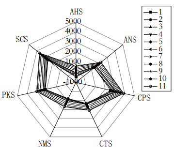 對所有樣品電子舌傳感器的響應(yīng)值繪制雷達(dá)圖(圖2),其中SCS傳感器、CPS傳感器的響應(yīng)值最高,其次是ANS傳感器、CTS傳感器、PKS傳感器的響應(yīng)值較高。通過味覺分析比較發(fā)現(xiàn)不同比例苦蕎米飯的滋味呈現(xiàn)一定的規(guī)律性,隨著苦蕎米添加量的增大,各傳感器的響應(yīng)值也隨之增大。上述結(jié)果表明,不同比例的苦蕎米飯滋味會(huì)因苦蕎米添加量的不同而逐漸變化。