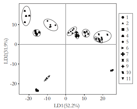 由于圖4中樣本間相互重疊,組內(nèi)樣品分布離散,分類效果并不理想,PCA不能區(qū)分樣本間的差異,故進(jìn)行線性判別分析(LDA)。LDA結(jié)果如圖5所示。由圖5可知,LD1的貢獻(xiàn)率為52.2%,LD2的貢獻(xiàn)率為31.9%,其累計(jì)貢獻(xiàn)率為84.1%,能夠反映樣品中的大部分氣味信息。1、2、11號(hào)樣本與其余樣本距離較遠(yuǎn),表明了1、2、11號(hào)樣本與其余樣本之間的差異較大。6~10號(hào)樣本距離較近,存在部分重疊現(xiàn)象,說明這幾組樣本氣味相似,并且隨著苦蕎米添加量的增大,樣本呈現(xiàn)出從左向右依次移動(dòng)的趨勢。1、2號(hào)樣本米飯的香味較重、苦蕎的香味較淡,苦蕎香味從3號(hào)樣本開始逐漸明顯,11號(hào)樣本苦蕎味過重。綜上所述,電子鼻結(jié)合線性判別分析可較好地區(qū)分不同比例苦蕎米飯。
