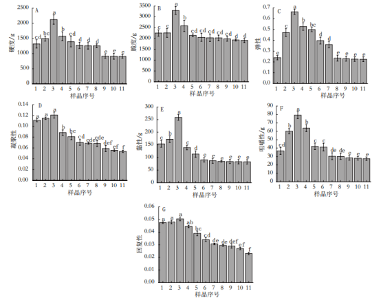 經(jīng)電子鼻鑒定,共鑒定出30種揮發(fā)性化合物,包括烷烴類、醇類、醛類、酯類及其他化合物。其中十一烷、十二烷、十三烷、十四烷、正十五烷、乙基苯、萘、壬醛、反式-2-壬烯醛、苯乙烯、2-十一酮、1-壬醇、1-辛烯-3-醇、十二醛的含量隨著苦蕎米添加量的增大而增大;己醛、1-丙醇、1-丁醇、2,3-戊二酮、2-庚酮、2-甲基丁醇、異丁醇、丁醛、2-甲基丁醛、異戊醇、戊醛、香草醛、鄰苯二甲酸二甲酯、棕櫚酸乙酯、棕櫚酸甲酯、乙酸丁酯的含量隨著苦蕎米添加量的增大而減小。此外,乙基苯、苯乙烯產(chǎn)生植物的味道,棕櫚酸甲酯產(chǎn)生鳩尾草的味道;壬醛、反式-2-壬烯醛、十二醛具有宜人的橘子香;1-壬醇、1-辛烯-3-醇、己醛、1-丙醇、1-丁醇、異戊醇、乙酸丁酯產(chǎn)生水果香味;2-十一酮、2,3-戊二酮、香草醛、棕櫚酸乙酯散發(fā)令人愉悅的奶油味;2-庚酮、2-甲基丁醛、戊醛具有堅(jiān)果香;萘、2-甲基丁醇、丁醛則會(huì)產(chǎn)生一些令人不愉快的氣味。04不同比例苦蕎米飯的質(zhì)構(gòu)特性分析